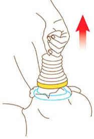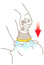 Placera bara masken över offrets mun och näsa. Tryck ner för att skapa sug. Sugets varaktighet är minimal, vilket gör LifeVac säkert och effektivt. Dra nu upp igen, och obstruktionen kommer ut ur offrets hals.